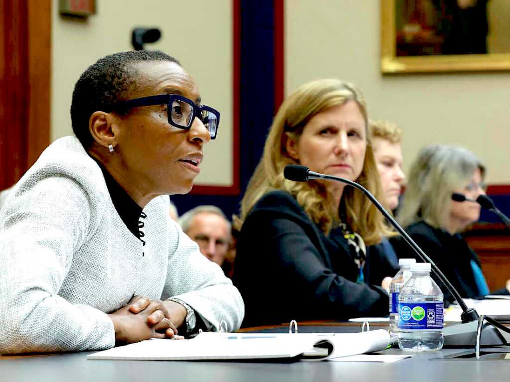Photo Claudine Gay, president of Harvard, Liz Magill president of Penn, Pamela Nadell (professor of history and Jewish studies at American University), and Sally Kornbluth, president of MIT, testifying before the House Education and Workforce Committee, December 5, 2023.